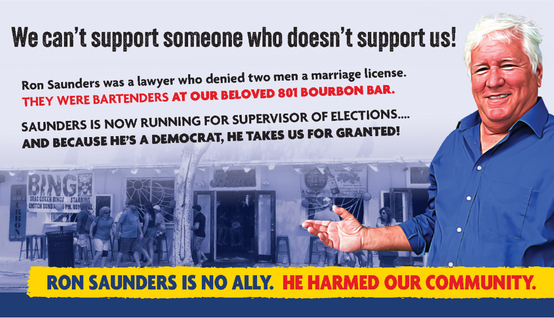 DEMOCRATS: Simultaneously mailed every registered Democrat in Key West, using Saunders’ anti-gay marriage history to sow doubt and dampen enthusiasm.